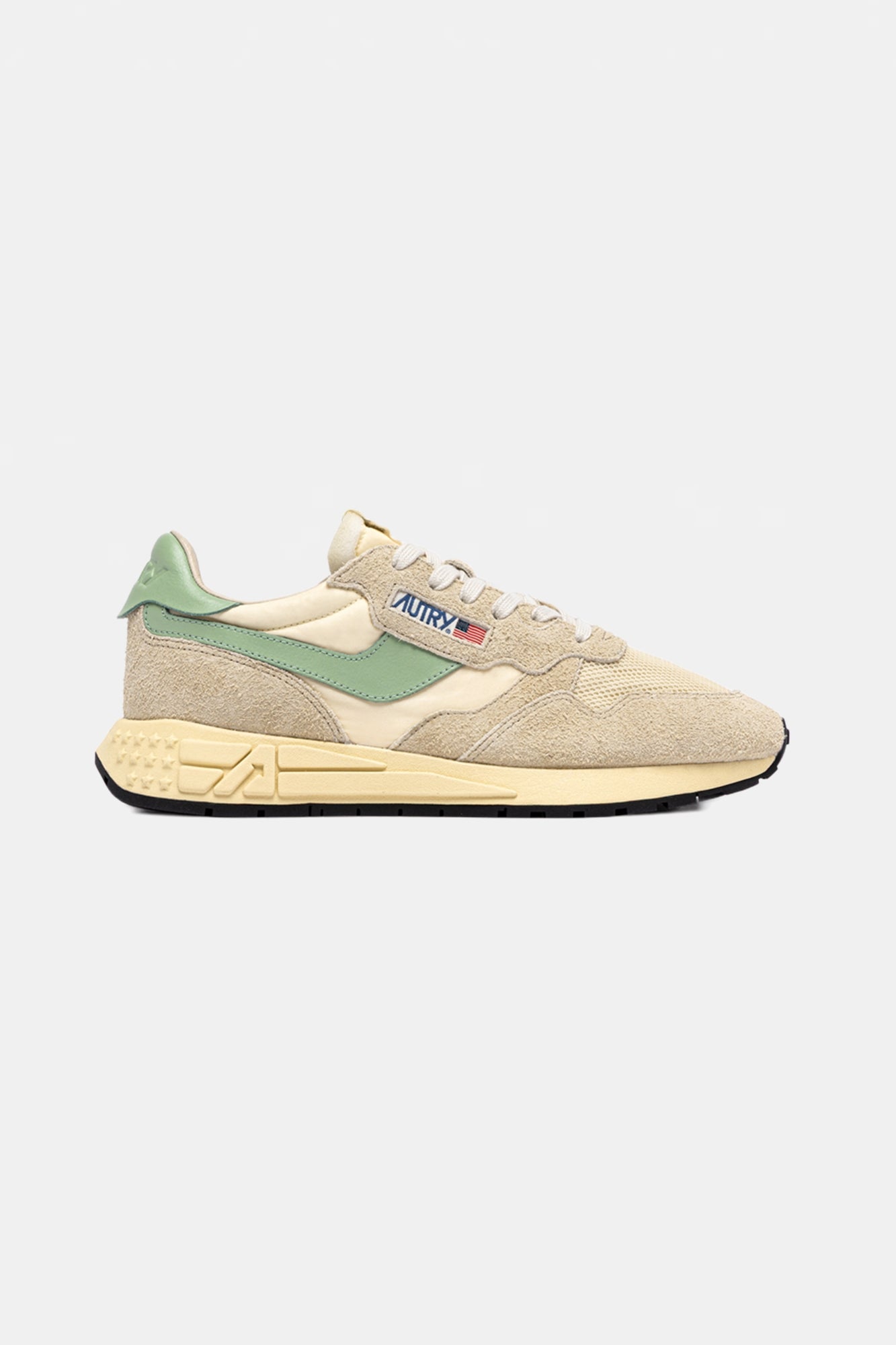 Designed for an active lifestyle, the sneakers offer a sleek, slender silhouette and a performance-driven construction that ensures freedom of movement. The rubber sole, with an embossed star-pattern tread, is further personalized with a modern reinterpretation of the Autry logo—featuring an A-arrow for a graphic, contemporary edge.