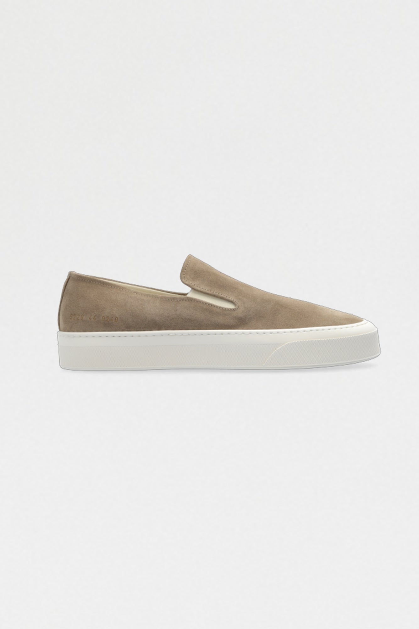 Common Projects presents its signature slip-on sneakers in a refined navy suede. Crafted in Italy with meticulous attention to detail, they feature a minimalist silhouette set atop slim rubber soles. The design is completed with the brand’s iconic gold-tone serial number stamped at the side, offering a subtle touch of distinction.